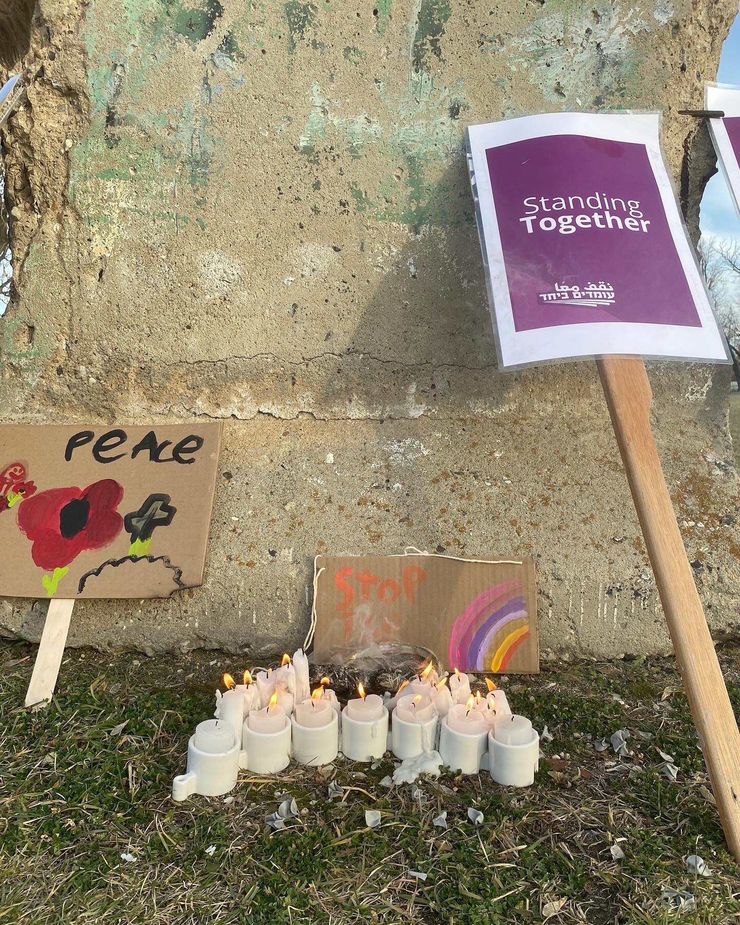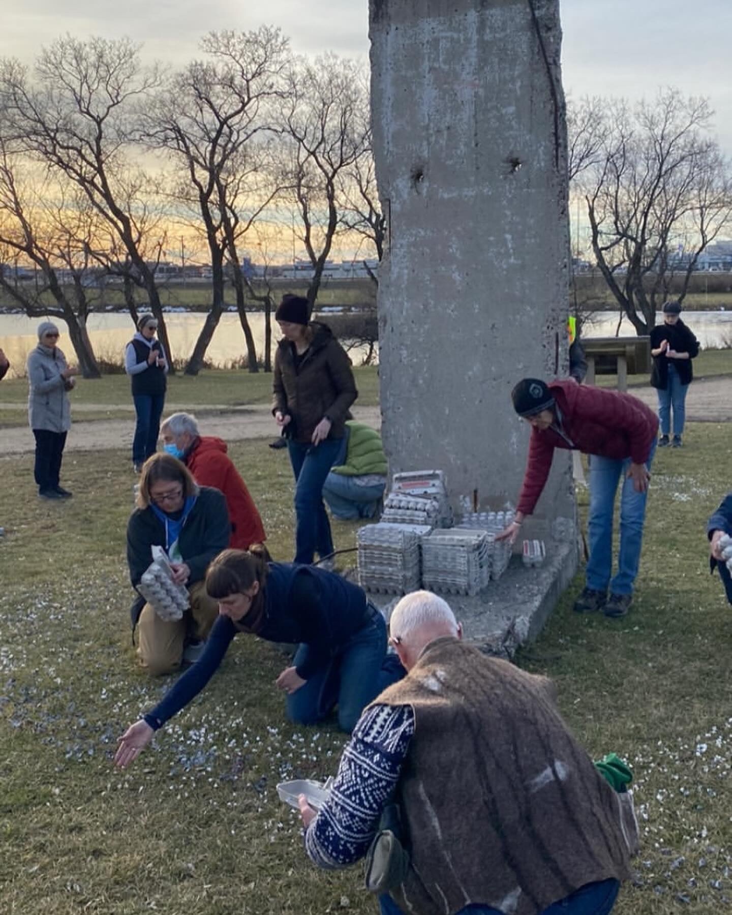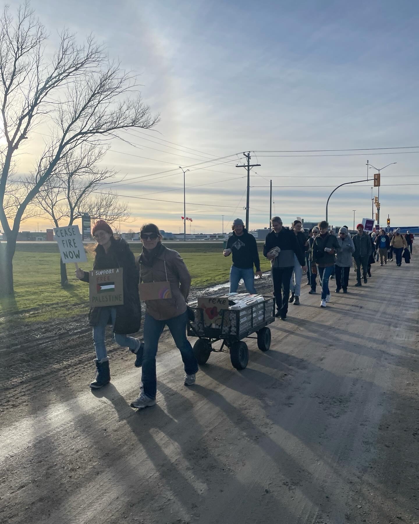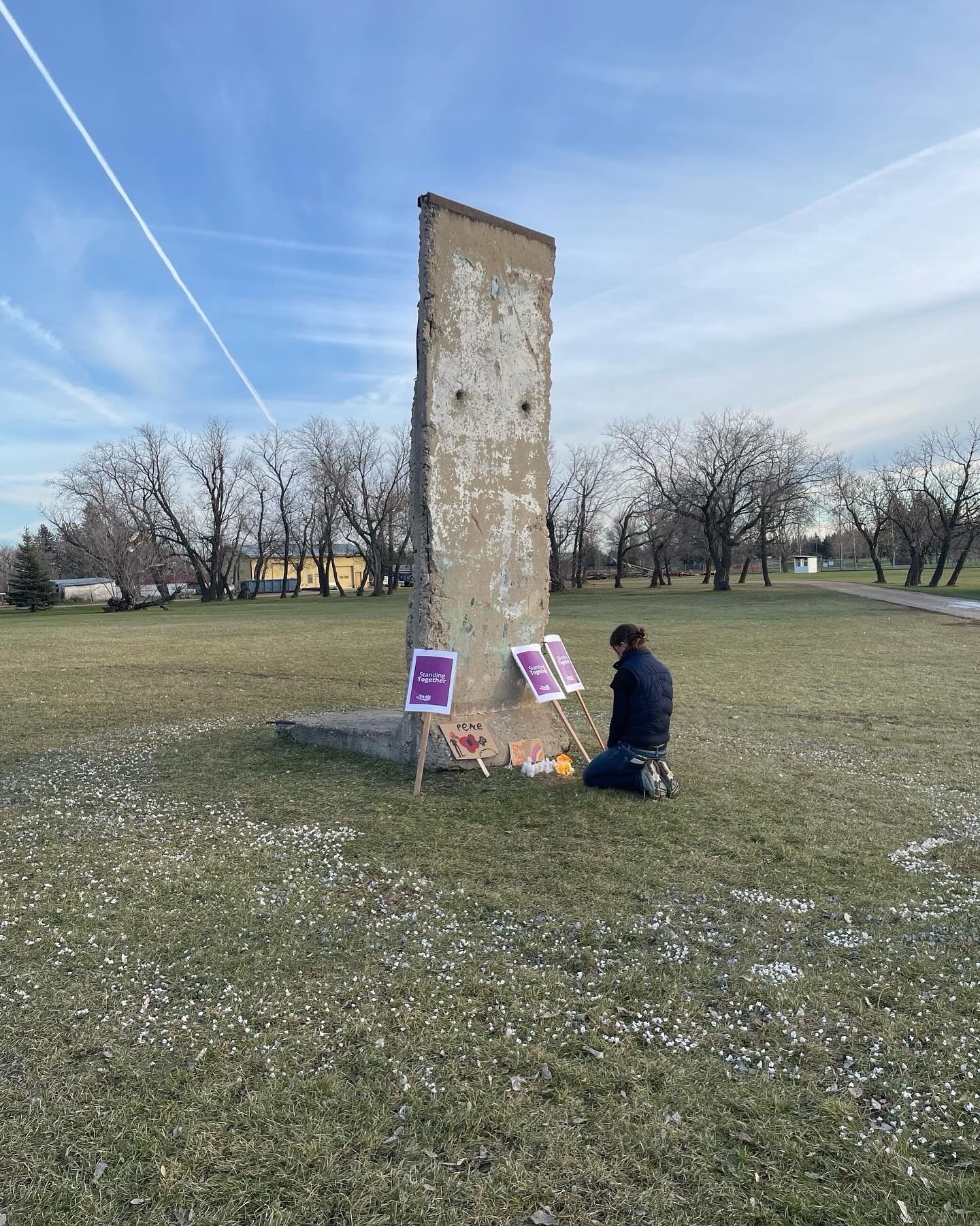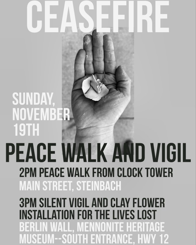 This Sunday members of the public met up with me and my friends for a Ceasefire Walk for Peace and Vigil in Steinbach. The walk ended at a piece of the Berlin Wall at the Mennonite Heritage Museum where we laid down 13000+ unfired clay flowers for those who have been killed in the violence between Israel and Gaza. Together we held vigil for those killed on both sides of this terrible conflict. Together we walked for ceasefire, liberation and peace.