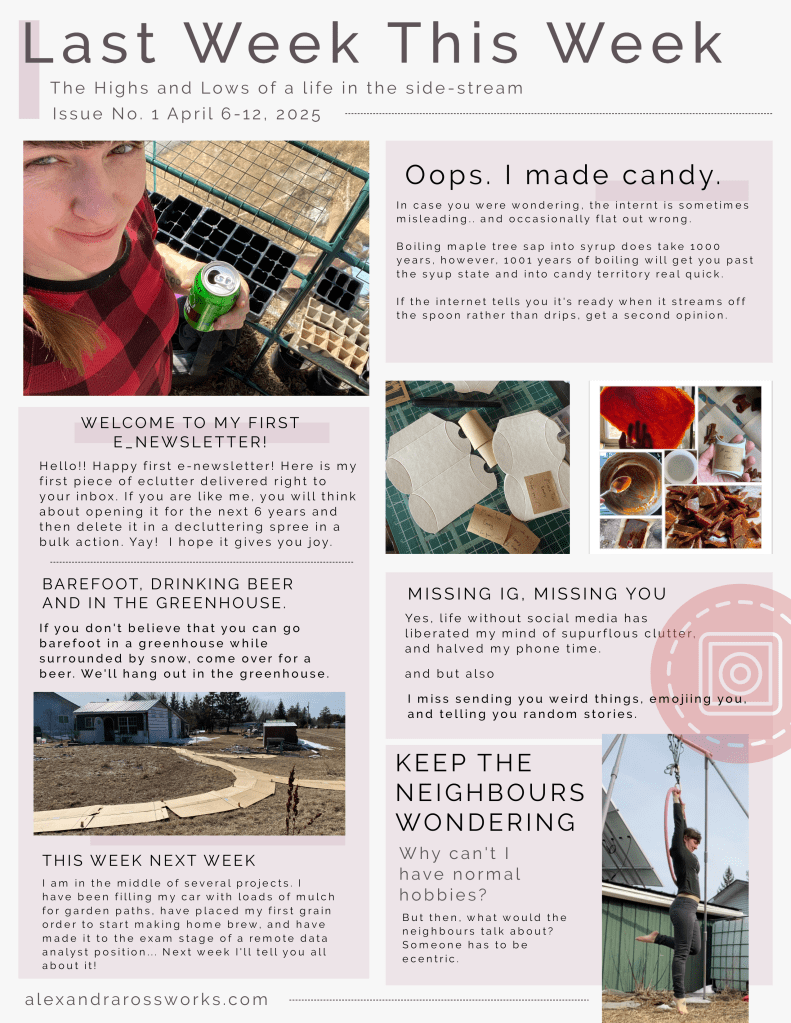 LAST WEEK THIS WEEK 0 April 15, 2025 Written by alexandraross Folks, the first edition of my e-newsletter droped moments ago. There is no telling where this will take me. It will go to my head. Share this: Click to share on Pinterest (Opens in new window) Pinterest Click to share on Facebook (Opens in new window) Facebook Click to share on X (Opens in new window) X Click to share on Tumblr (Opens in new window) Tumblr More Click to share on Pocket (Opens in new window) Pocket Click to share on Reddit (Opens in new window) Reddit Click to share on LinkedIn (Opens in new window) LinkedIn Click to print (Opens in new window) Print Click to email a link to a friend (Opens in new window) Email Like Loading... Related