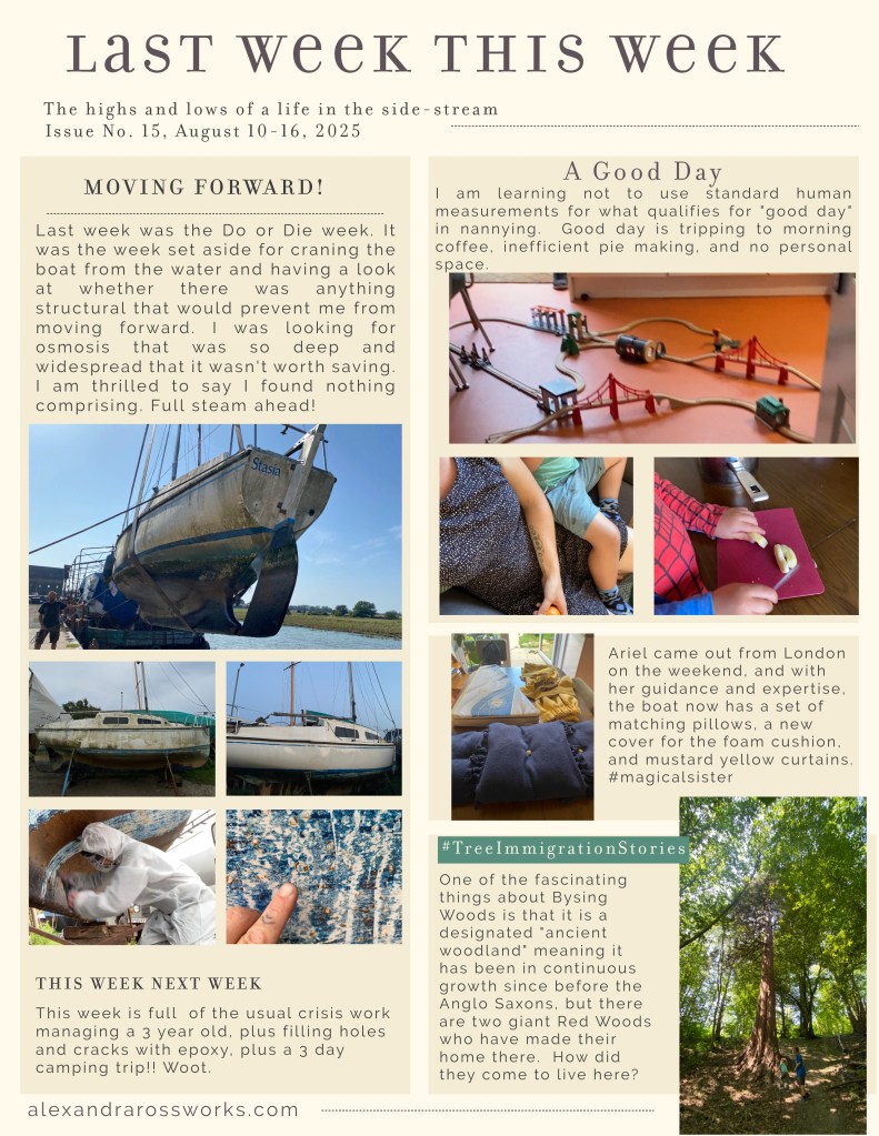 Last Week This Week No. 15 0 August 20, 2025 Written by alexandraross A week of tripping over trains to coffee, meeting immigrant Redwoods, and looking underneath a little Itchen Ferry. Share this: Click to share on Pinterest (Opens in new window) Pinterest Click to share on Facebook (Opens in new window) Facebook Click to share on X (Opens in new window) X Click to share on Tumblr (Opens in new window) Tumblr More Click to share on Pocket (Opens in new window) Pocket Click to share on Reddit (Opens in new window) Reddit Click to share on LinkedIn (Opens in new window) LinkedIn Click to print (Opens in new window) Print Click to email a link to a friend (Opens in new window) Email Like Loading... Related