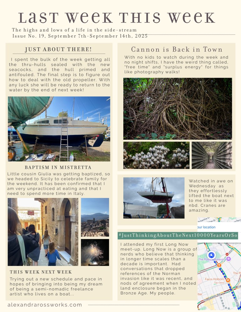 Last Week This Week 0 September 17, 2025 Written by alexandraross Just a family weekend in Sicily for a baptism. As you do. Share this: Click to share on Pinterest (Opens in new window) Pinterest Click to share on Facebook (Opens in new window) Facebook Click to share on X (Opens in new window) X Click to share on Tumblr (Opens in new window) Tumblr More Click to share on Pocket (Opens in new window) Pocket Click to share on Reddit (Opens in new window) Reddit Click to share on LinkedIn (Opens in new window) LinkedIn Click to print (Opens in new window) Print Click to email a link to a friend (Opens in new window) Email Like Loading... Related