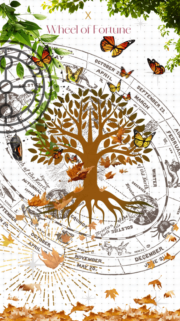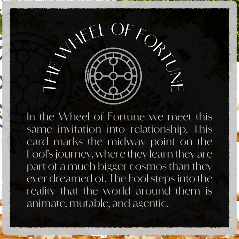 In the Wheel of Fortune we meet this same invitation into relationship. This card marks the midway point on the Fool’s journey, where they realize they are part of a much bigger cosmos than they ever dreamed of. The Fool steps into the reality that the world around them is animate, mutable, and agentic. Within this cosmic dance there are many cycles. No longer able to bumble along in ignorance, believing in their own omnipotence, they must contend with the invitation to surrender to forces beyond their control. In this realization they are invited to see themselves as a part of a whole rather than apart from it.