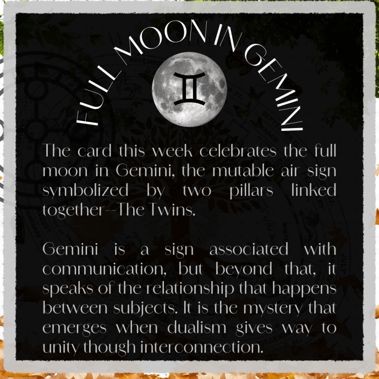 Celebrating a big beautiful full moon in Gemini this week with the tenth card of the Major Arcana: The Wheel of Fortune. This week the moon makes her way across the mutable air sign Gemini—The Twins. Symbolized by twin pillars, visual ideas of duality emerge in the paleolithic, as far back as 20,000 years, with double goddess figure carved from Mammoth bone in Avdeevo, Russia. (Read more about the mythology here!)