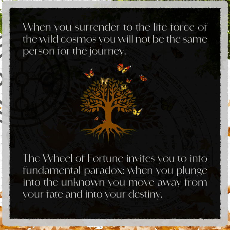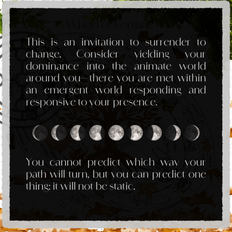 This is an invitation to surrender to change. The Wheel of Fortune invites you to consider yielding your dominance into the animate world around you—there you are met within an emergent world responding and responsive to your presence. You cannot predict which way your path will turn, but you can predict one thing: it will not be static. When you surrender to this life force of the wild cosmos you will not be the same person for the journey. This card invites you to into fundamental paradox: when you plunge into the unknown you move away from your fate and into your destiny.
