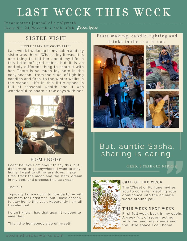Last Week This Week 0 December 6, 2025 Written by alexandraross Last week, a year ago, my sister visited me in my cabin. It was great. Share this: Click to share on Pinterest (Opens in new window) Pinterest Click to share on Facebook (Opens in new window) Facebook Click to share on X (Opens in new window) X Click to share on Tumblr (Opens in new window) Tumblr More Click to share on Pocket (Opens in new window) Pocket Click to share on Reddit (Opens in new window) Reddit Click to share on LinkedIn (Opens in new window) LinkedIn Click to print (Opens in new window) Print Click to email a link to a friend (Opens in new window) Email Like Loading... Related